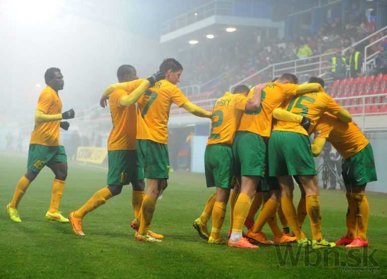 Hráči MŠK Žilina sa tešia z gólu v sieti Zlatých Moraviec počas zápasu 18. kola futbalovej Fortuna ligy. Zlaté Moravce, 21. november 2014. Foto: SITA/Martin Havran