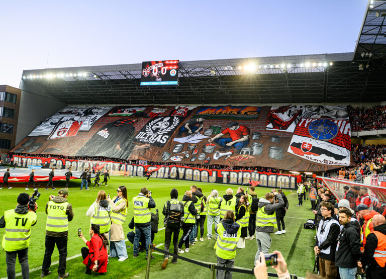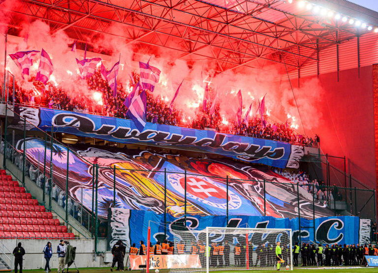 Pohľad na choreo fanúšikov Slovan Bratislava pred začiatkom futbalového zápasu 11. kola Niké ligy 2025/2026 medzi FC Spartak Trnava - ŠK Slovan Bratislava. Trnava, 18. október 2025. Foto: SITA/Martin Havran