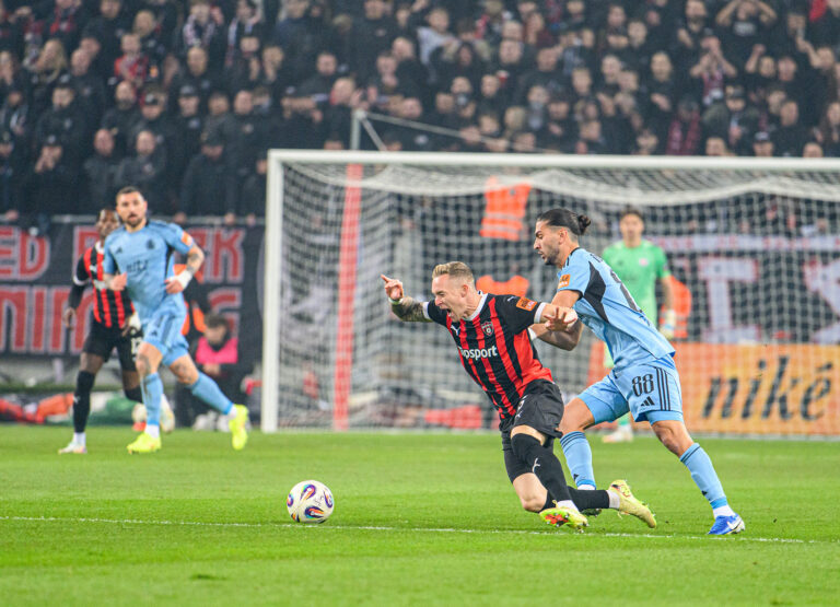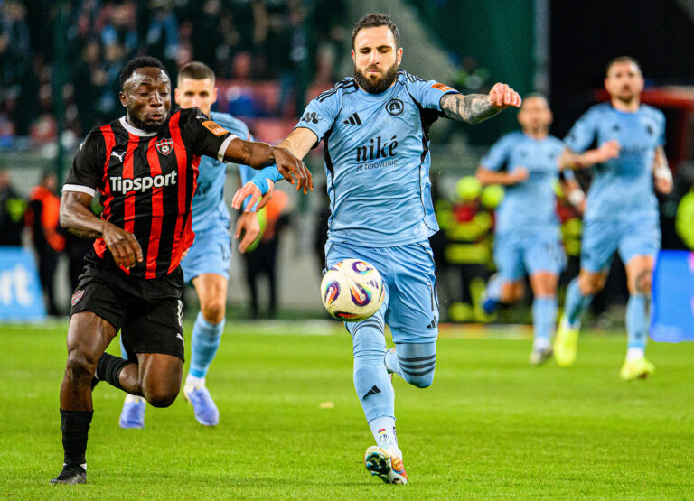 Zľava: Roman Prochádzka z FC Spartak Trnava a Kyriakos Savvidis z ŠK Slovan Bratislava počas futbalového zápasu 11. kola Niké ligy 2025/2026 medzi FC Spartak Trnava - ŠK Slovan Bratislava. Trnava, 18. október 2025. Foto: SITA/Martin Havran