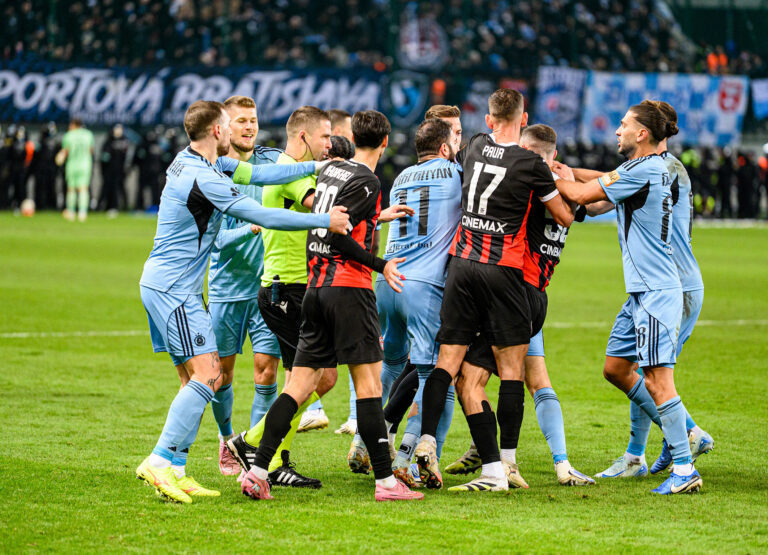 Roztržka medzi hráčmi po strelení druhého gólu počas futbalového zápasu 11. kola Niké ligy 2025/2026 medzi FC Spartak Trnava - ŠK Slovan Bratislava. Trnava, 18. október 2025. Foto: SITA/Martin Havran