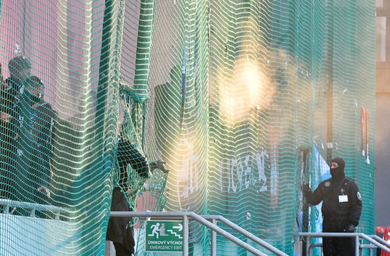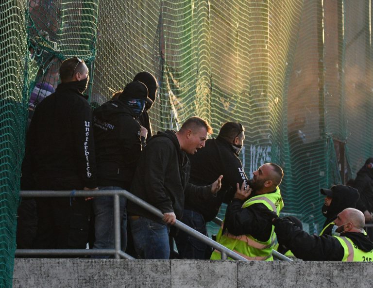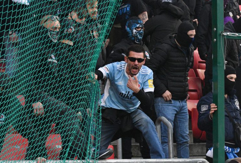 Potýčka medzi fanúšikmi ŠK Slovan Bratislava a FC Spartak Trnava na hracej ploche počas prerušeného futbalového zápasu 10. kola základnej časti Fortuna ligy 2021/2022 medzi FC Spartak Trnava - ŠK Slovan Bratislava. Trnava, 17. október 2021. Foto: SITA/Martin Medňanský
