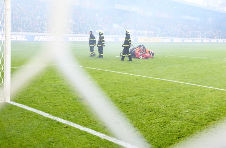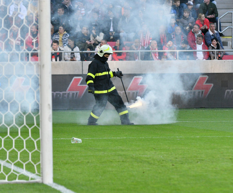 Hasič likviduje svetlicu na hracej ploche počas futbalového zápasu 10. kola základnej časti Fortuna ligy 2021/2022 medzi FC Spartak Trnava - ŠK Slovan Bratislava. Trnava, 17. október 2021. Foto: SITA/Martin Medňanský