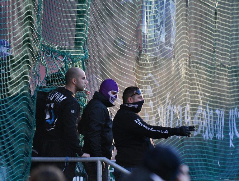 Fanúšikovia ŠK Slovan Bratislava počas prerušeného futbalového zápasu 10. kola základnej časti Fortuna ligy 2021/2022 medzi FC Spartak Trnava - ŠK Slovan Bratislava. Trnava, 17. október 2021. Foto: archívne, SITA/Martin Medňanský