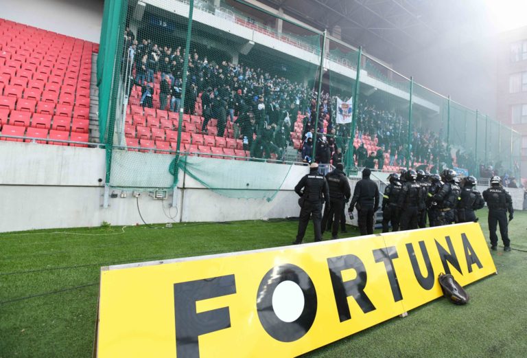 Polícia vytláča fanúšikov ŠK Slovan Bratislava zo sektoru hostí počas prerušeného futbalového zápasu 10. kola základnej časti Fortuna ligy 2021/2022 medzi FC Spartak Trnava - ŠK Slovan Bratislava. Trnava. Foto: archívne, SITA/Martin Medňanský