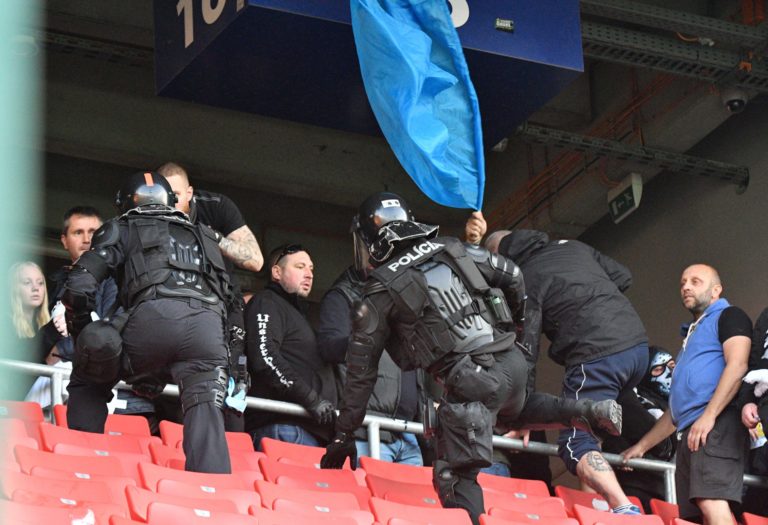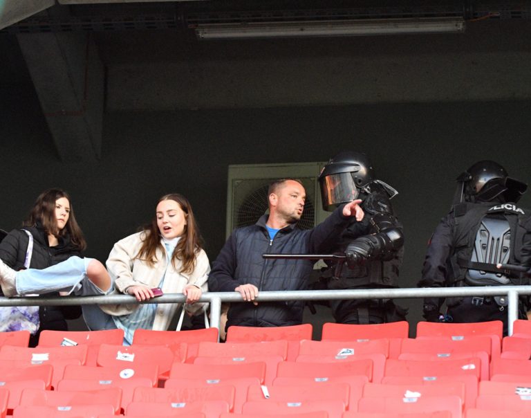 Polícia vytláča fanúšikov ŠK Slovan Bratislava zo sektoru hostí počas prerušeného futbalového zápasu 10. kola základnej časti Fortuna ligy 2021/2022 medzi FC Spartak Trnava - ŠK Slovan Bratislava. Trnava, 17. október 2021. Foto: SITA/Martin Medňanský
