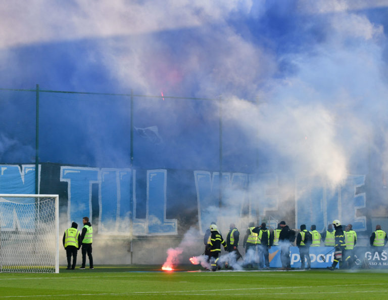 Fanúšikovia FC Spartak Trnava počas prerušeného futbalového zápasu 10. kola základnej časti Fortuna ligy 2021/2022 medzi FC Spartak Trnava - ŠK Slovan Bratislava. Trnava, 17. október 2021. Foto: SITA/Martin Medňanský
