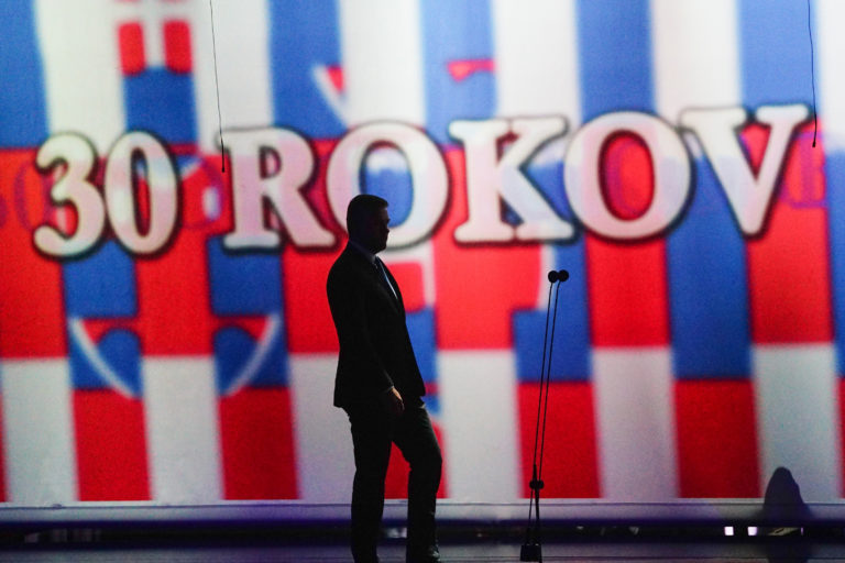 Predseda vlády SR Peter Pellegrini v príhovore počas galavečera pri príležitosti osláv 30. výročia Nežnej revolúcie organizovaného Úradom vlády SR a Ministerstvom kultúry SR v novej budove Slovenského národného divadla v Bratislave. Bratislava, 17. november 2019. Foto: SITA/Úrad vlády SR