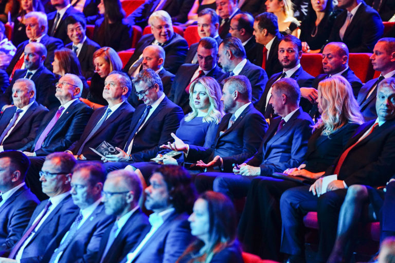 Zľava v druhej rade: Predseda Ústavnoprávneho výboru Róbert Madej, prezidentka SR Zuzana Čaputová, predseda vlády SR Peter Pellegrini, predseda vlády ČR Andrej Babiš, manželka predsedu vlády ČR Monika Babišová a predseda vlády Maďarska Viktor Orbán, manželka predsedu vlády Maďarska Anikó Lévai a minister zahraničných vecí Poľska Jacek Czaputowicz počas galavečera pri príležitosti osláv 30. výročia Nežnej revolúcie organizovaného Úradom vlády SR a Ministerstvom kultúry SR v novej budove Slovenského národného divadla v Bratislave. Bratislava, 17. november 2019. Foto: SITA/Úrad vlády SR