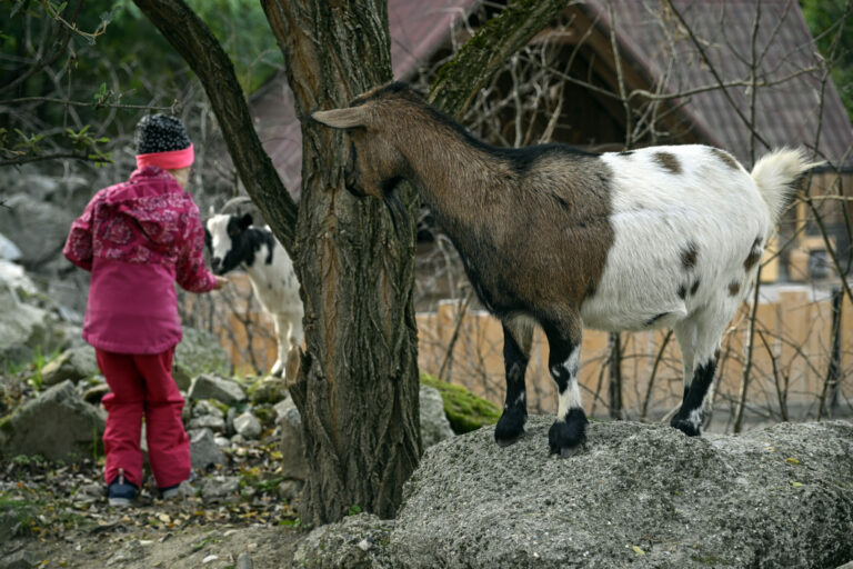 Dieťa kŕmi kozu domácu (Capra hircus) v zoologickej záhrade v Bratislave v Gazdovskom dvore s kontaktnou lúkou, ktorú po zatvorení v dôsledku povodní opätovne sprístupnili verejnosti. Bratislava, 19. október 2024. Foto: SITA/Milan Illík