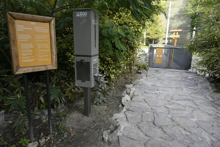 Kŕmny automat nainštalovaný v bambusovej záhrade pri vstupe na kontaktnú lúku v zoologickej záhrade v Bratislave, ktorú po zatvorení v dôsledku povodní opätovne sprístupnili verejnosti. Bratislava, 19. október 2024. Foto: SITA/Milan Illík