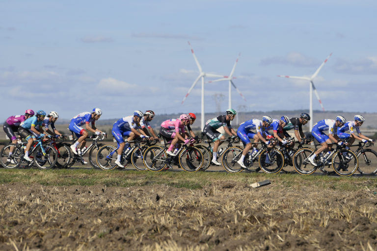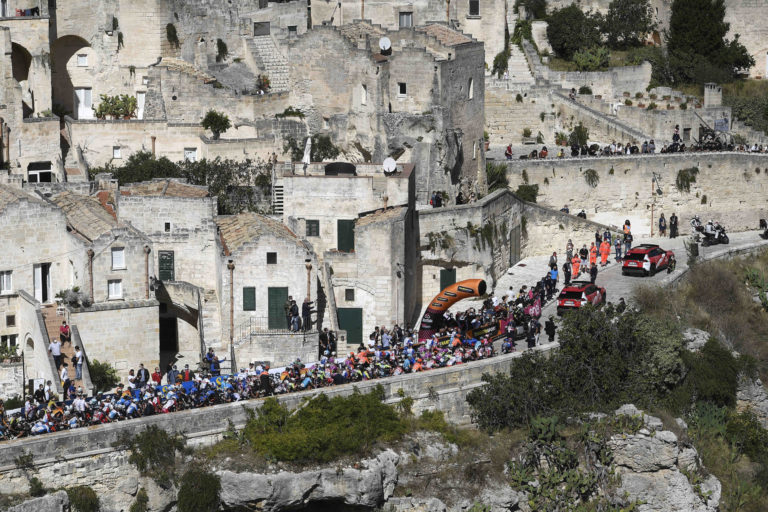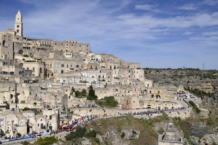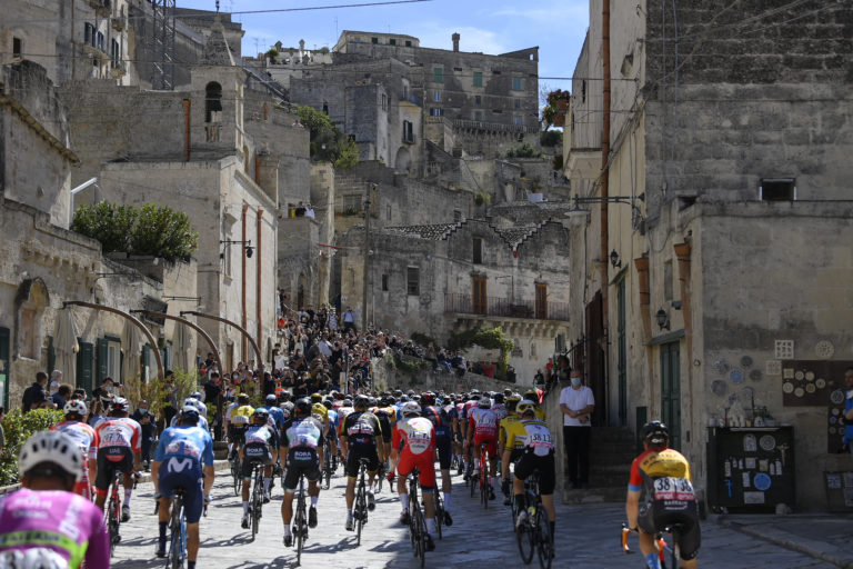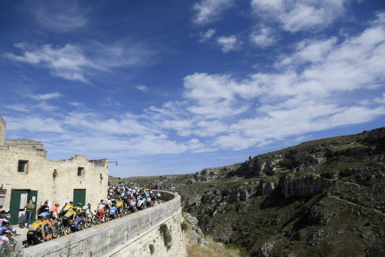 Cyklisti počas siedmej etapy Giro d'Italia 2020 so štartom v Matere a cieľom v Brindisi. Foto: Fabio Ferrari/LaPresse via AP.
