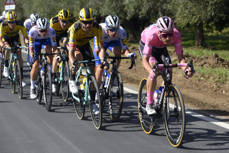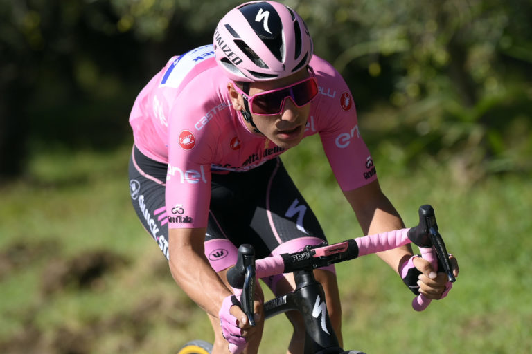Portugalčan João Almedia v ružovom drese lídra počas siedmej etapy Giro d'Italia 2020 so štartom v Matere a cieľom v Brindisi. Foto: Fabio Ferrari/LaPresse via AP.