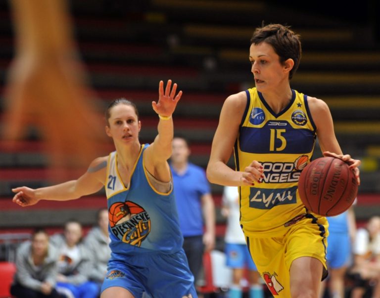 Sprava: Žofia Hruščáková a Lynetta Kizer z Košíc a Kateřina Bartoňová a Tamara Tatham z Piešťan vo finále Slovenského pohára v basketbale žien medzi Good Angels Košice - Piešťanské čajky. Foto: SITA/Ján Slovák