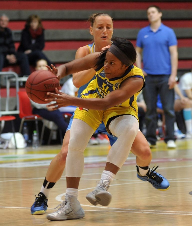 Jia Perkins (vpredu) z Košíc a Kateřina Bartoňová z Piešťan vo finále Slovenského pohára v basketbale žien medzi Good Angels Košice - Piešťanské čajky. Foto: SITA/Ján Slovák