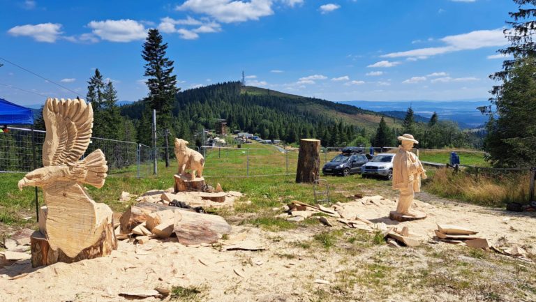 Drevené sochy vyrezávaní počas Goralských folklórnych slávností. Bachledova dolina, Ždiar, 12. augusta 2023. Foto: SITA/Mária Frisová.