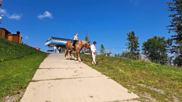 Jazda na koni v sprievode goralského chlapa. Bachledova dolina, Ždiar, 12. augusta 2023 Foto: SITA/Mária Frisová.