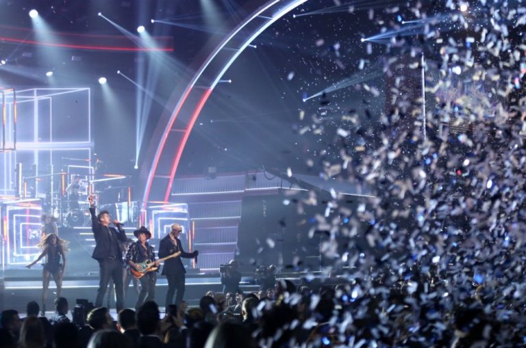 Robin Thicke, Joe Perry a Pitbull počas svojho vystúpenia na Grammy Awards. Los Angeles, 15. február 2016. Foto: Matt Sayles/Invision/AP
