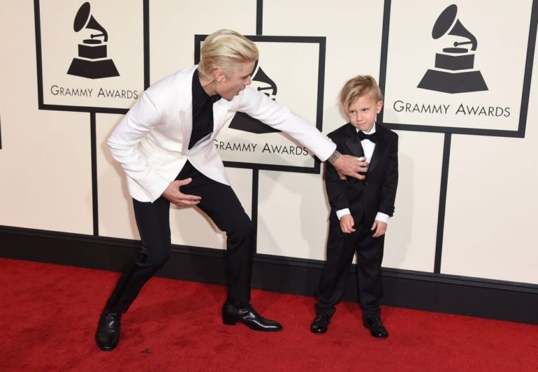 Justin Bieber a Jaxon Bieber prichádzajú na odovzdánie Grammy Awards. Los Angeles, 15. február 2016. Foto: Jordan Strauss/Invision/AP