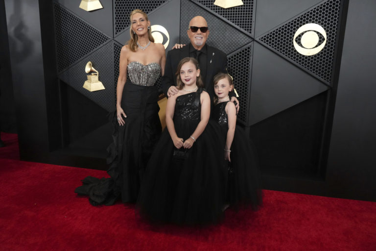 Zľava: Alexis Joel, Billy Joel, Della Rose Joel a Remy Anne Joel prichádzajú na 66. ročník odovzdávania cien Grammy. Foto: SITA/AP