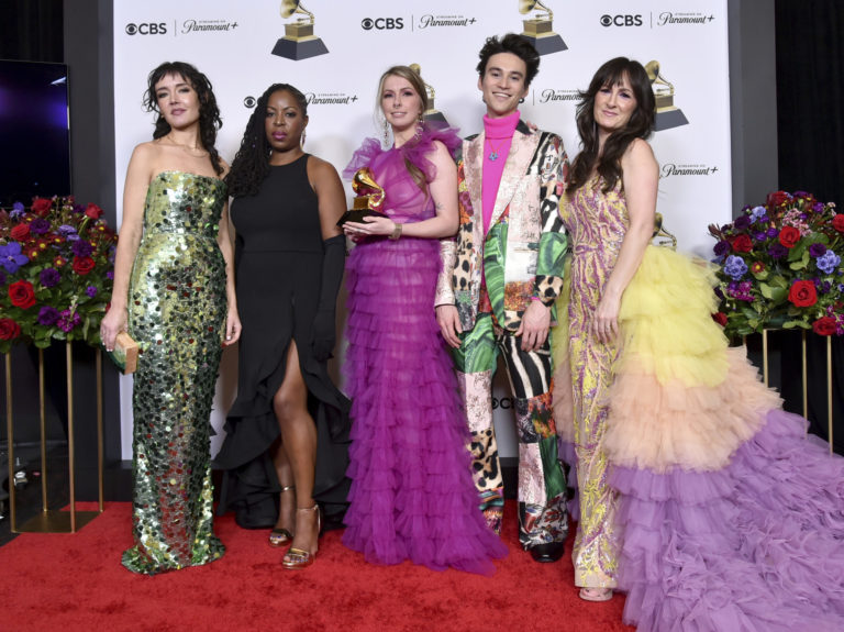 Zľava: Erin Bentlage, Johnaye Kendrick, Amanda Taylor, Jacob Collier a Sara Gazarek pózujú s cenou za najlepší aranžmán, nástroje a spev za skladbu „In the Wee Small Hours of the Morning“ od Saje s Jacobom Collierom počas 66. ročníka odovzdávania cien Grammy. Foto: SITA/AP