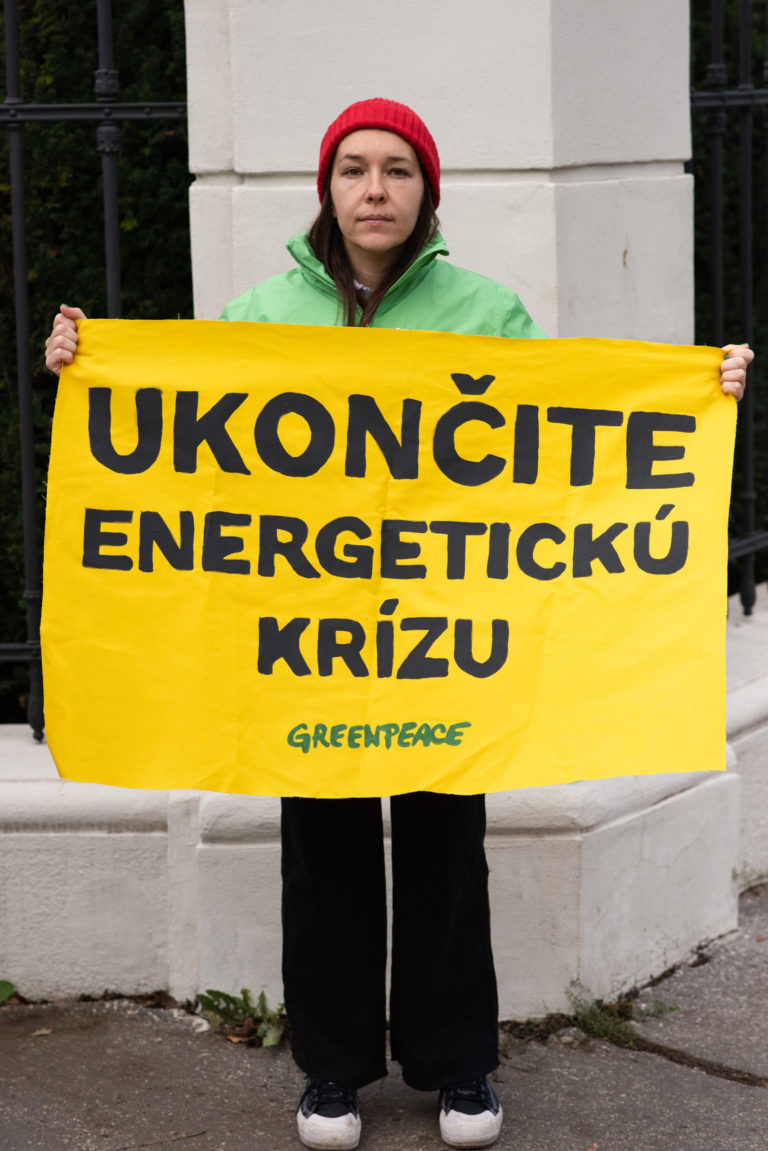Členka environmentálnej organizácie Greenpeace Slovensko počas spustenia verejnej výzvy Za zimu bez (c)hladu, prostredníctvom ktorej žiadá vládu SR o okamžité riešenie energetickej krízy. Bratislava, 8. november 2022. Foto: SITA/Tomáš Halász