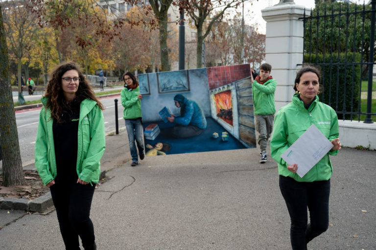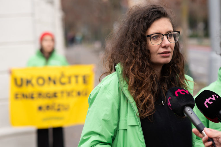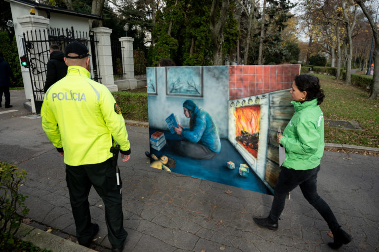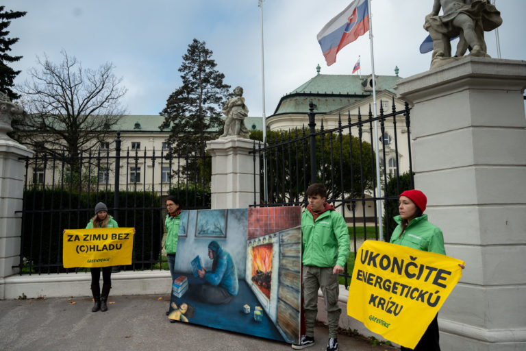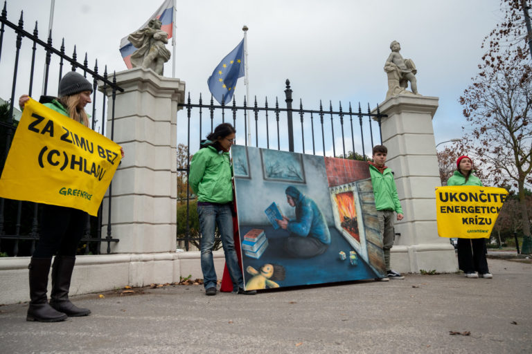 Členovia environmentálnej organizácie Greenpeace Slovensko počas spustenia verejnej výzvy Za zimu bez (c)hladu, prostredníctvom ktorej žiadajú vládu SR o okamžité riešenie energetickej krízy. Bratislava, 8. november 2022. Foto: SITA/Tomáš Halász