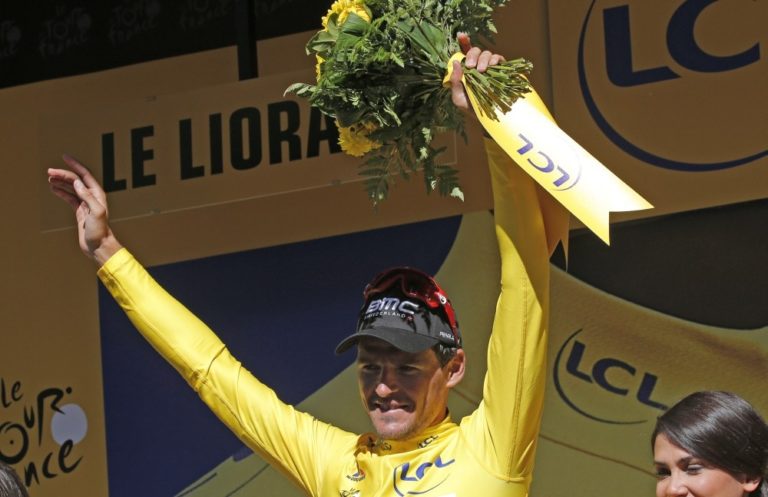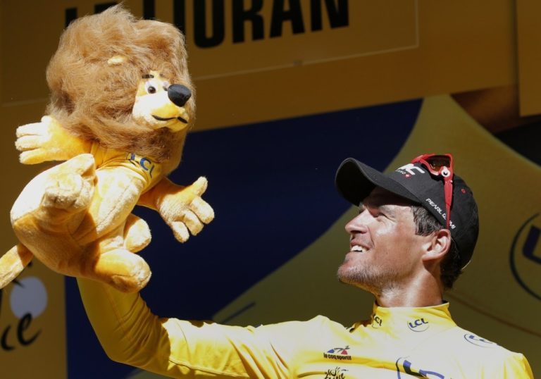 Belgičan Greg Van Avermaet v žltom drese na stupni víťazov po 5. etape Tour de France, ktorá viedla z Limoges do Le Lioran a merala 216 kilometrov. Foto: SITA/AP