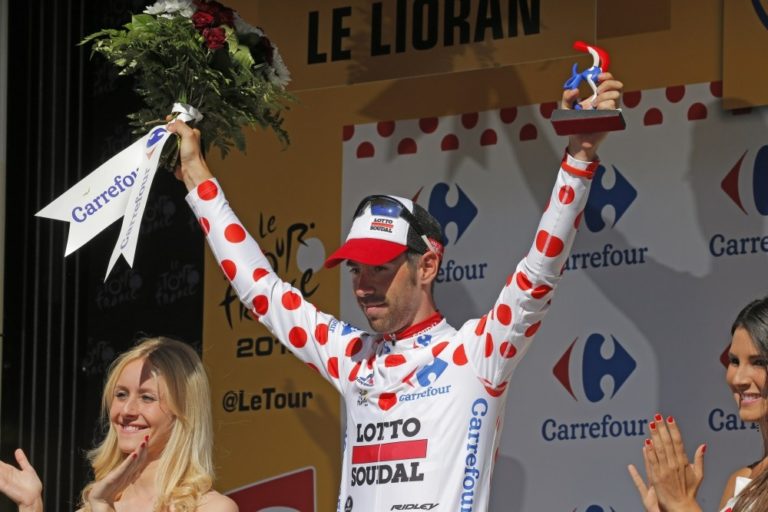 Belgičan Thomas de Gendt na stupni víťazov v bodkovanom drese po 5. etape Tour de France, ktorá viedla z Limoges do Le Lioran a merala 216 kilometrov. Foto: SITA/AP