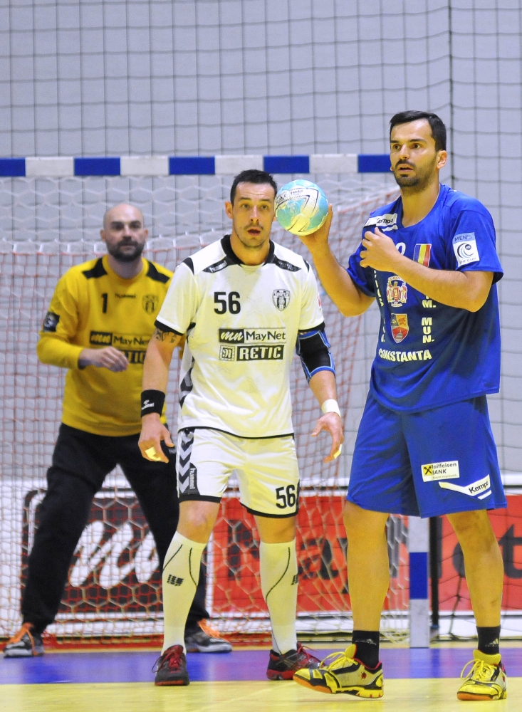 Zľava: Hráč Hlohovca Dušan Olejár a hráč Konstancy Marius Stavrositu počas pohárového zápasu EHF CUP v hádzanej medzi HC Sporta Hlohovec a HCM Konstanca. Foto: SITA/Ivan Kopčáni
