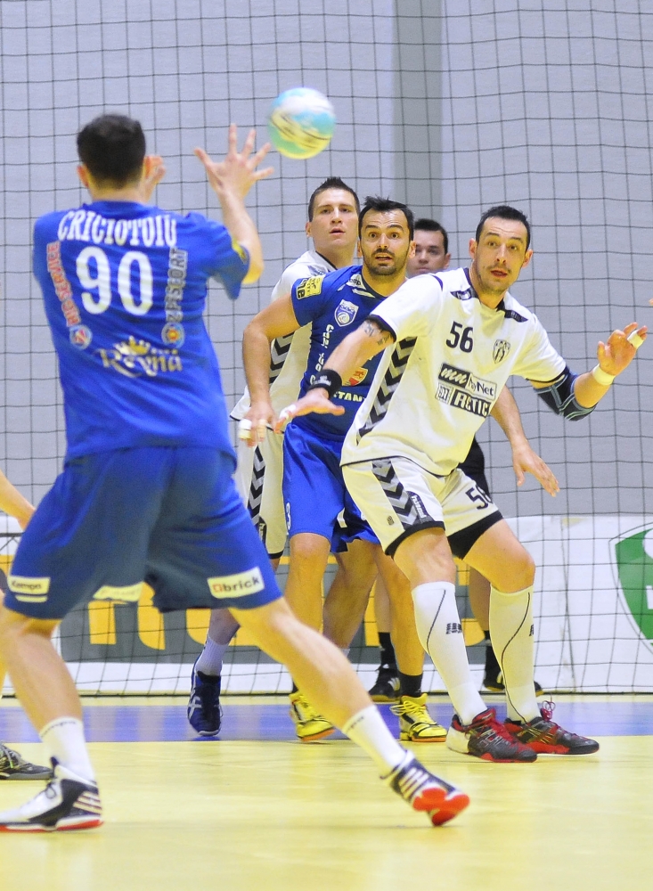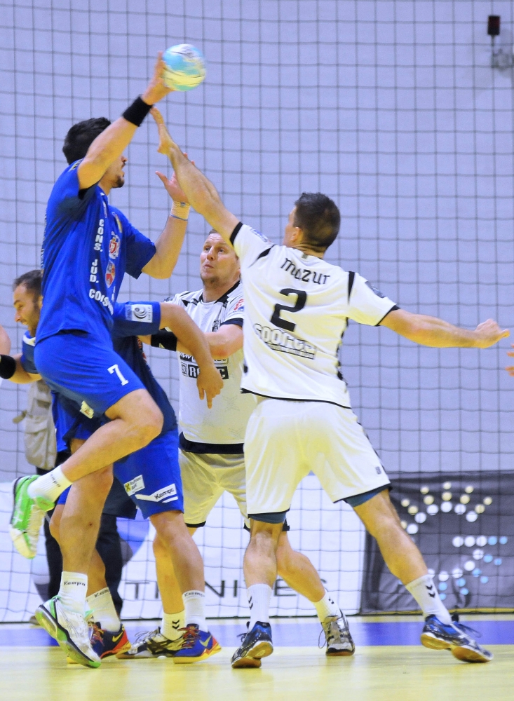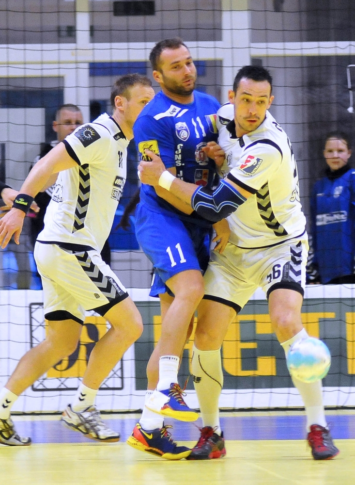 Zľava: Hráči Hlohovca Dušan Olejár a Peter Dudáš a hráč Konstancy Ioan Marius Novanc počas pohárového zápasu EHF CUP v hádzanej medzi HC Sporta Hlohovec a HCM Konstanca. Foto: SITA/Ivan Kopčáni