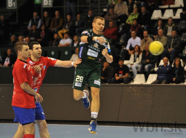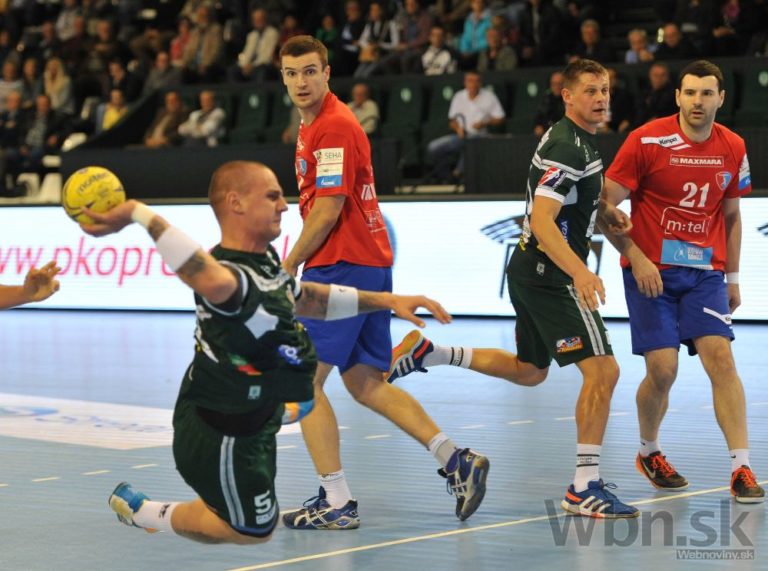 Michal Kopčo z Prešova (vľavo) v zápase 5.kola SEHA GSS League medzi Tatran Prešov (SVK) - Borac M:tel BAnja Luka (Bosna a Hercegovina). Prešov, 27. september 2014. Foto: SITA/Viktor Zamborský