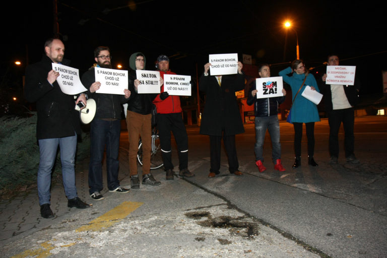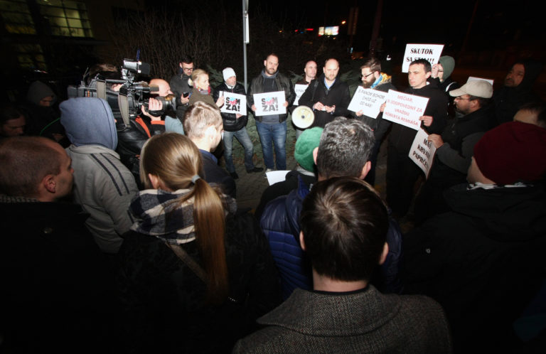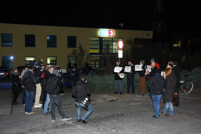 Protestujúci pred budovou TA3 počas diskusnej relácie na tému zrušenia tzv. Mečiarových amnestií. Bratislava, 7. marec 2017. Foto SITA/Peter Maďar