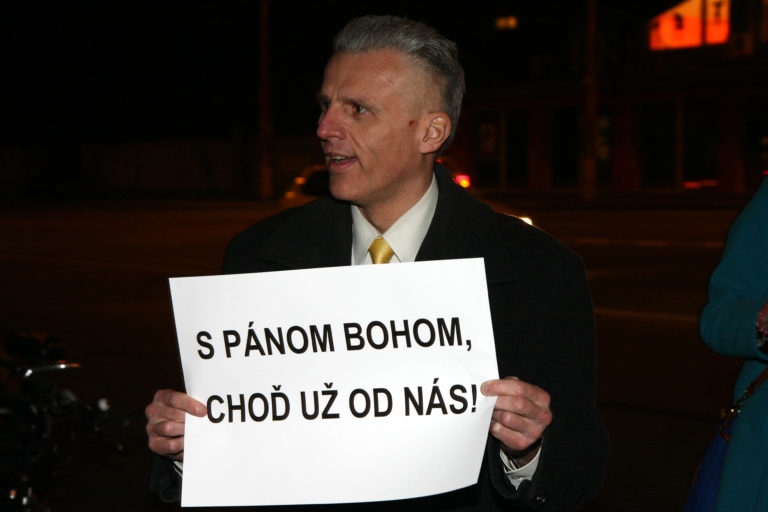Zľava: Poslanci NR SR za stranu Sloboda a Solidarita Jozef Viskupič a Martin Poliačik protestujú pred budovou TA3 počas diskusnej relácie na tému zrušenia tzv. Mečiarových amnestií. Bratislava, 7. marec 2017. Foto SITA/Peter Maďar
