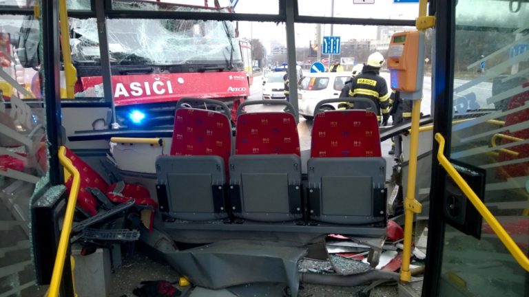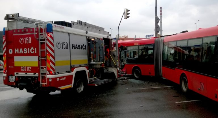 Dopravná nehoda autobusu linky 63 Dopravného podniku Bratislava a vozidla hasičov pri bratislavskom Hyper Tescu Lamač. Foto: SITA/Ľudovít Vaniher
