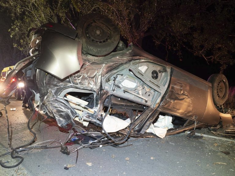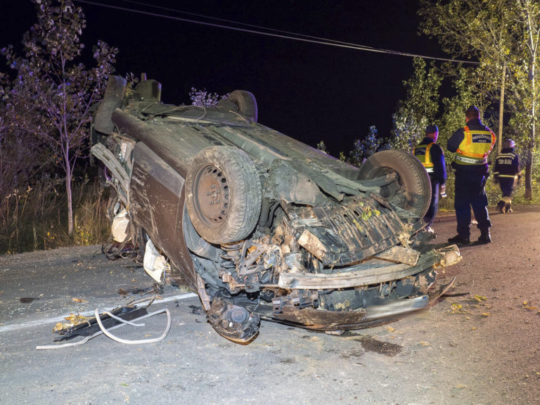 Prevrátené auto, ktoré prevážalo nelegálnych migrantov, narazilo do stromu neďaleko mesta Kiskunmajsa. Foto: SITA/AP