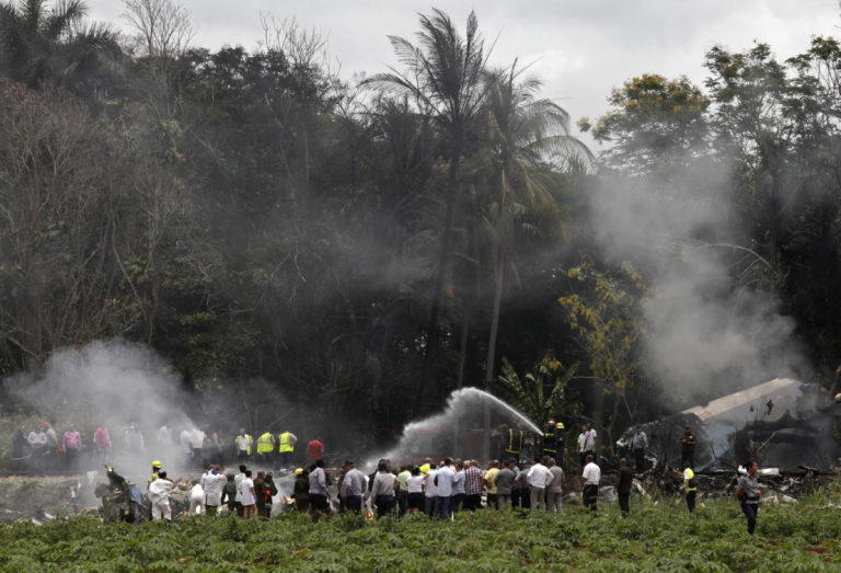 Hasiči zasahujú a hasia trosky lietadla, ktoré sa zrútilo krátko po štarte z kubánskeho letiska José Martí, Havana, Kuba, 18. máj 2018 Foto: SITA/AP