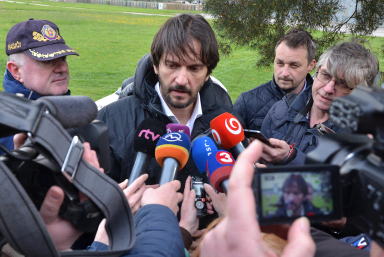 Zľava: Prezident HaZZ Alexander Nejedlý a minister vnútra SR Robert Kaliňák počas stretnutia s novinármi neďaleko miesta pádu policajného vrtuľníka BL429 vo vojenskom priestore letiska v Prešove. Zo štyroch ľudí na palube všetci utrpeli ťažké zranenia, ktorým dvaja podľahli. Prešov, 10. máj 2017. Foto: SITA/Viktor Zamborský