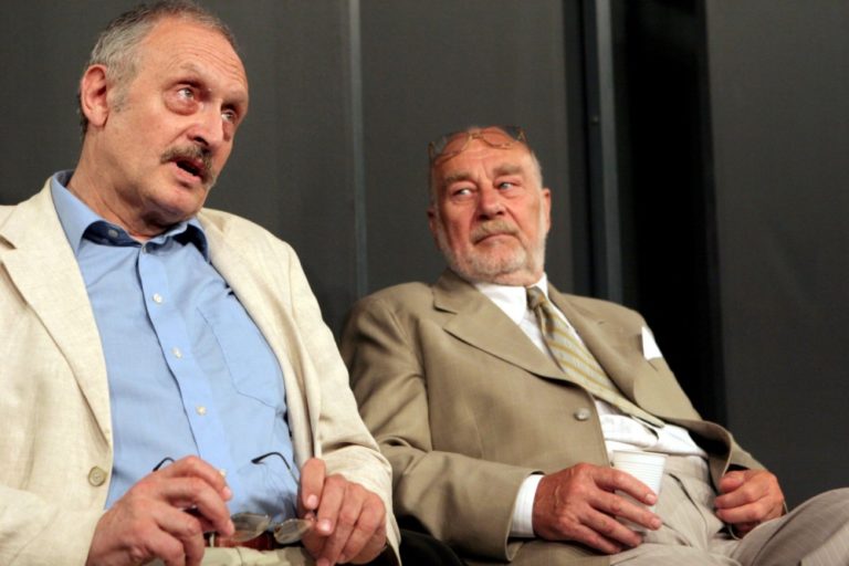 Zľava: Herci František Kovár a Leopold Haverl na tlačovej besede činohry SND po generálke divadelnej hry S mamou. Bratislava, 7. jún 2007. Foto: SITA/Nina Bednáriková