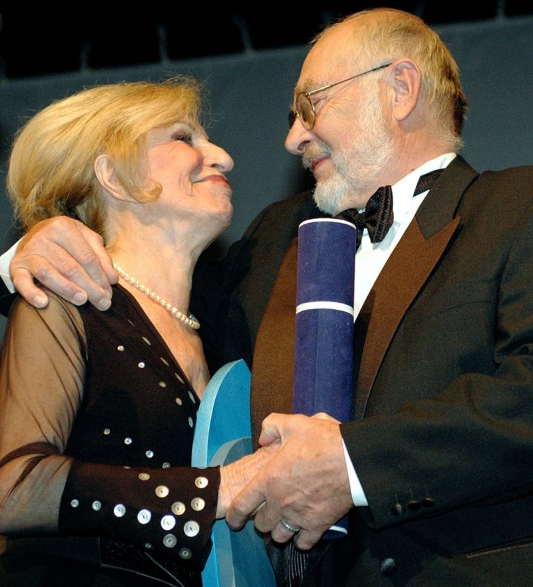 Herec Leopold Haverl (vpravo) gratuluje svojej kolegyni zo Slovenského národného divadla Márii Kraľovičovej k Cene Jozefa Krónera za celoživotné herecké dielo, ktorú si prevzala vo zvolenskom Divadle Jozefa Gregora Tajovského. L.Haverl bol laureátom tejto ceny v minulom roku. Zvolen, 29. október 2007. Foto: SITA/Dušan Hein