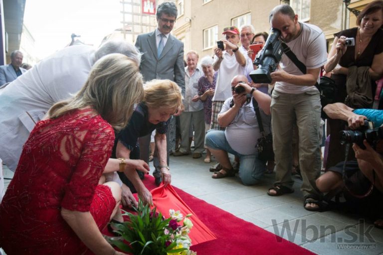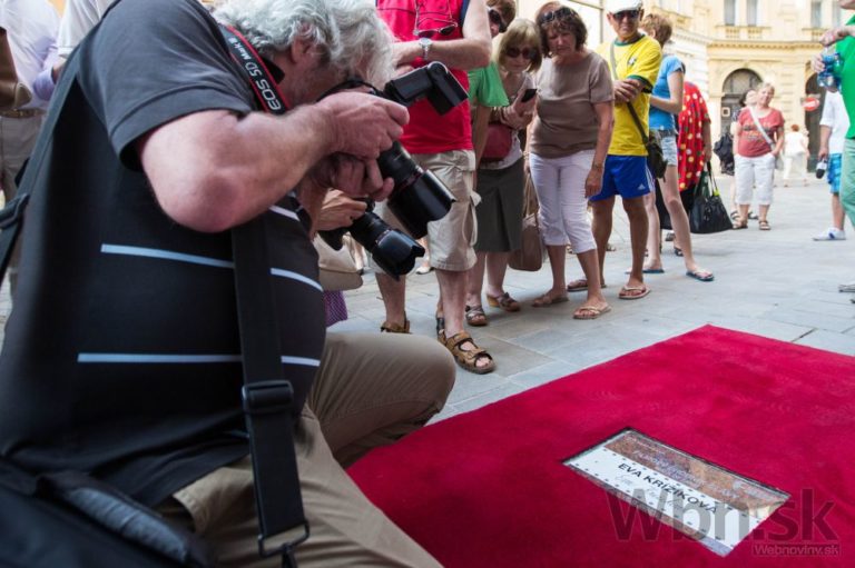 Herečka Eva Krížiková (tretia zľava) odhaľuje pamätnú dlaždicu so svojím menom na Filmovom chodníku slávy pred Mestským divadlom P. O. Hviezdoslava. Bratislava, 12. jún 2014. Foto: SITA/Jozef Jakubčo