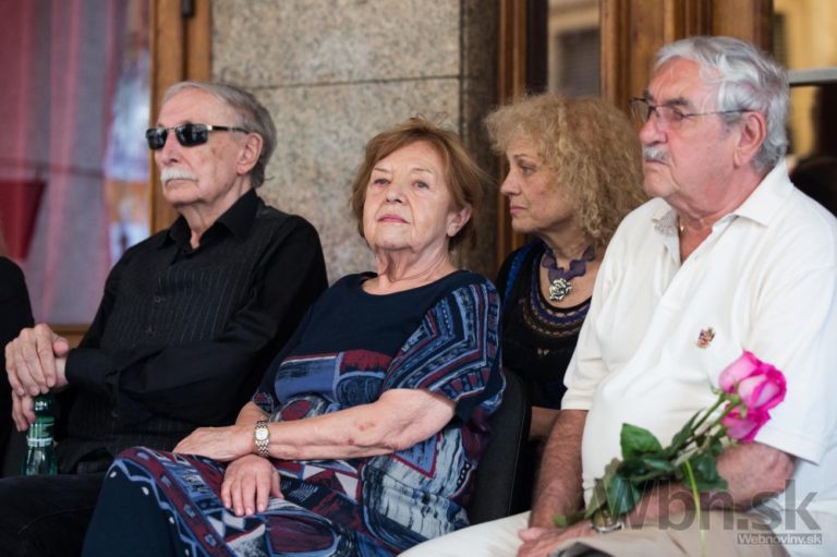 Sprava: Herci Štefan Kvietik, Soňa Valentová, Eva Krížiková a Ladislav Chudík počas slávnostného osadenia pamätnej dlaždice s menom herečky Evy Krížikovej na Filmový chodník slávy pred Mestským divadlom P. O. Hviezdoslava. Bratislava, 12. jún 2014. Foto: SITA/Jozef Jakubčo