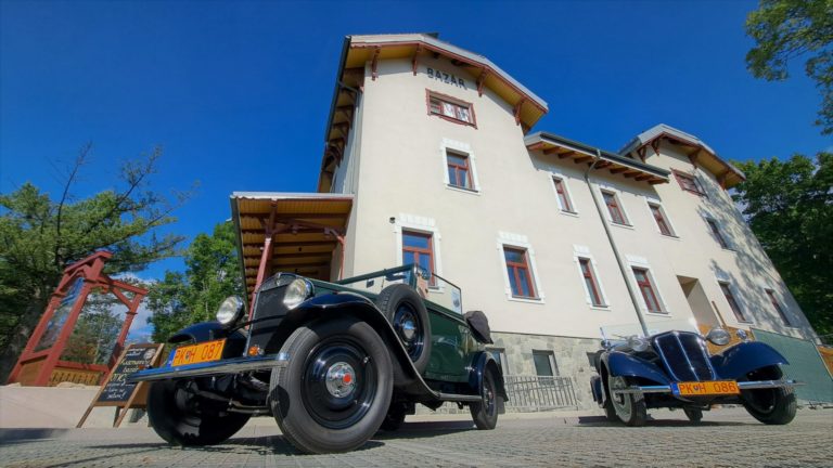 Zrekonštruovaná budova Kuszmannovho bazára, v popredí vystavené historické vozidlá. Tatranská Lomnica, Vysoké Tatry, 12. augusta 2023. Foto: SITA/Mária Frisová.