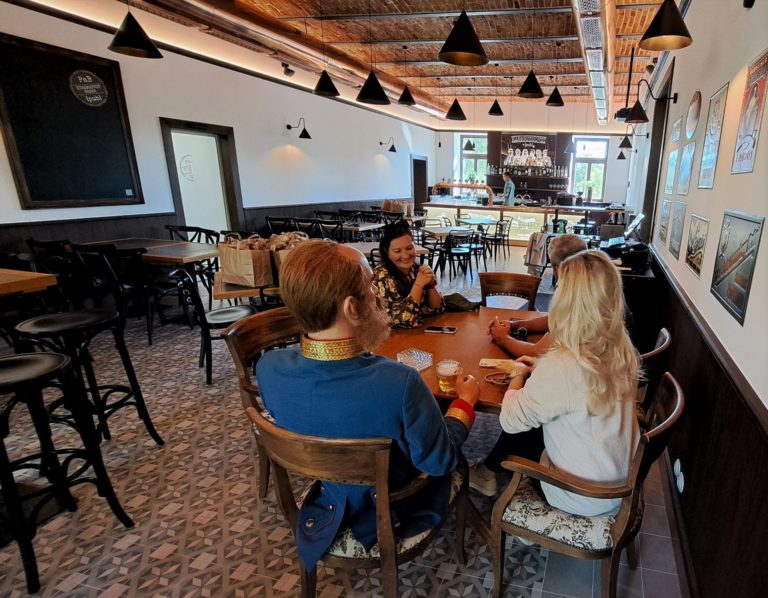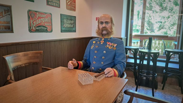 Návštevníci priestorov Kuszmannovho bazára za jedným stolom s replikou cisára Františka Jozefa. Tatranská Lomnica, Vysoké Tatry, 12. augusta 2023. Foto: SITA/Mária Frisová.