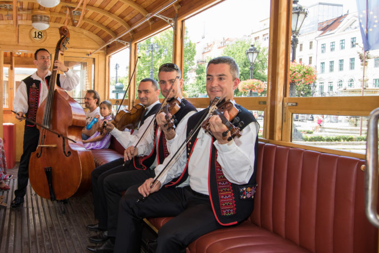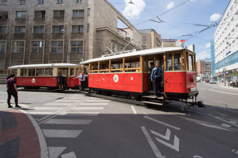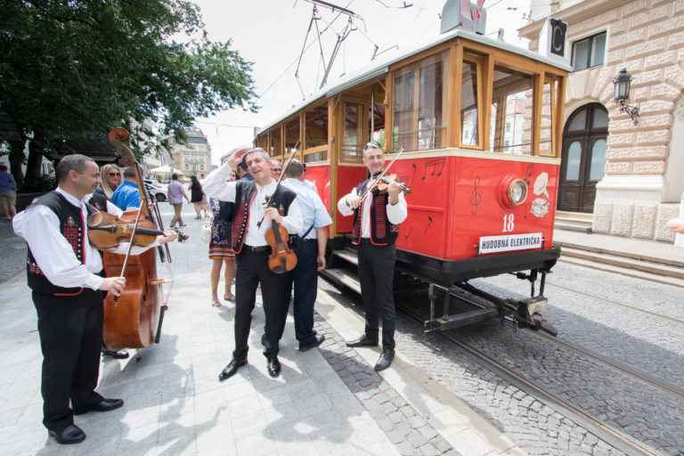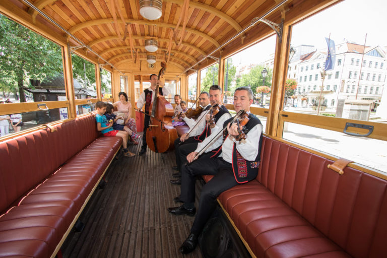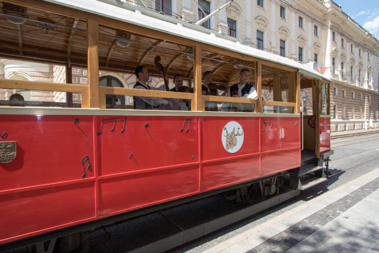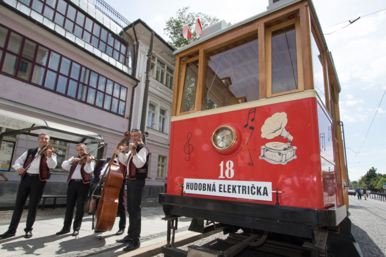 Prvá jazda historickej hudobnej električky, ktorú vypravil Dopravný podnik Bratislava v rámci Kultúrneho leta 2017. Foto: SITA/Ľudovít Vaniher
