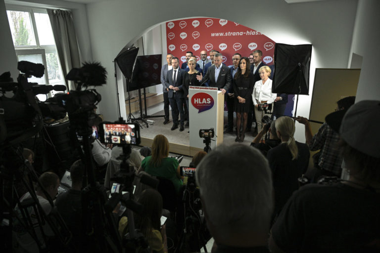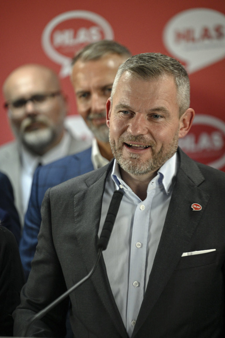 Predseda strany Hlas-SD Peter Pellegrini (uprostred) počas tlačovej besedy po rokovaní predsedníctva strany HLAS - sociálna demokracia (HLAS-SD) k aktuálnej politickej situácii. Bratislava, 10. október 2023. Foto: SITA/Milan Illík