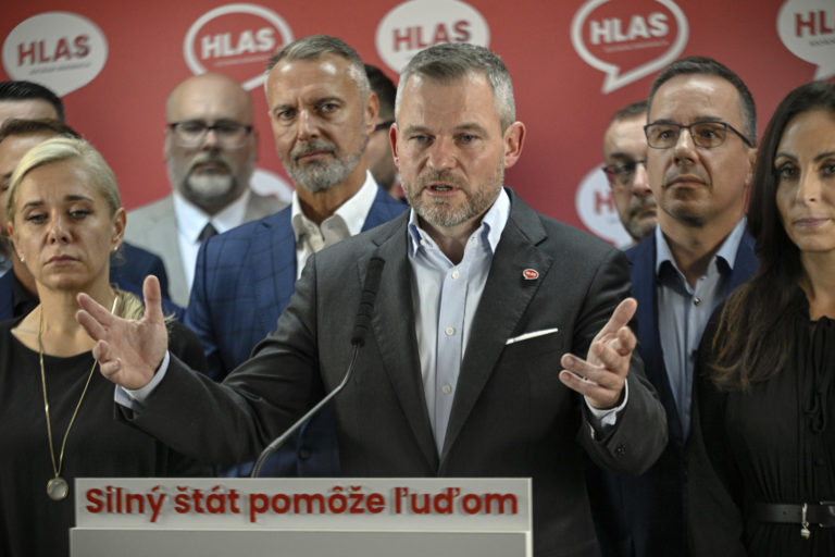 Predseda strany HLAS-SD Peter Pellegrini počas tlačovej besedy po rokovaní predsedníctva strany HLAS - sociálna demokracia (HLAS-SD) k aktuálnej politickej situácii. Bratislava, 10. október 2023. Foto: SITA/Milan Illík