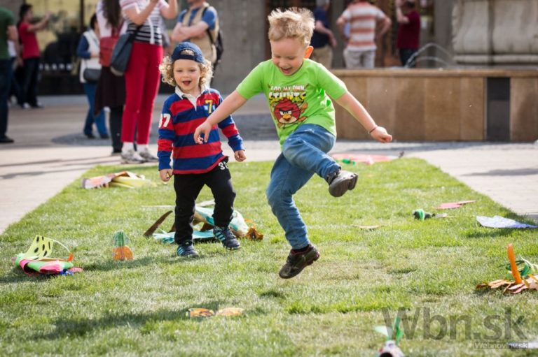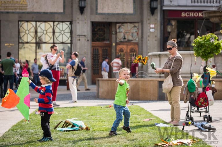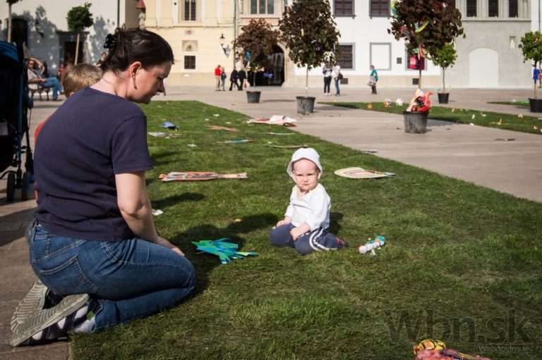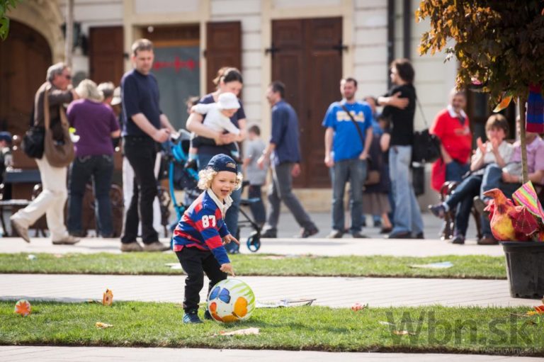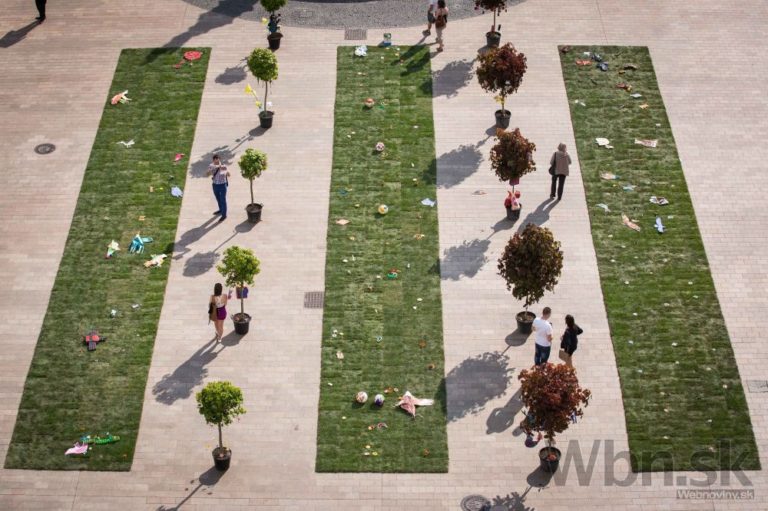 Pohľad na trávový koberec a stromy v kvetináčoch na Hlavnom námestí v Bratislave, ktoré sú súčasťou projektu Živé námestie.