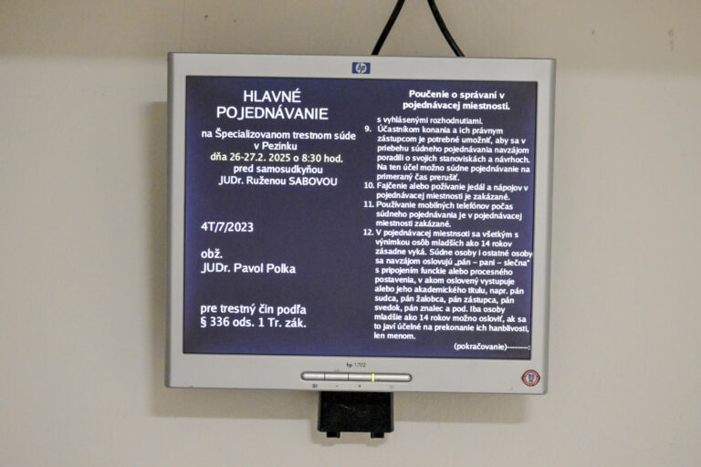 Obrazovka s informáciami pred hlavným pojednávaním s obvineným bývalým žilinským sudcom Pavlom Polkom, ktorý je stíhaný pre trestný čin nepriamej korupcie, na Špecializovanom trestnom súde v Pezinku. Pezinok, 26. február 2025. Foto: SITA/Milan Illík