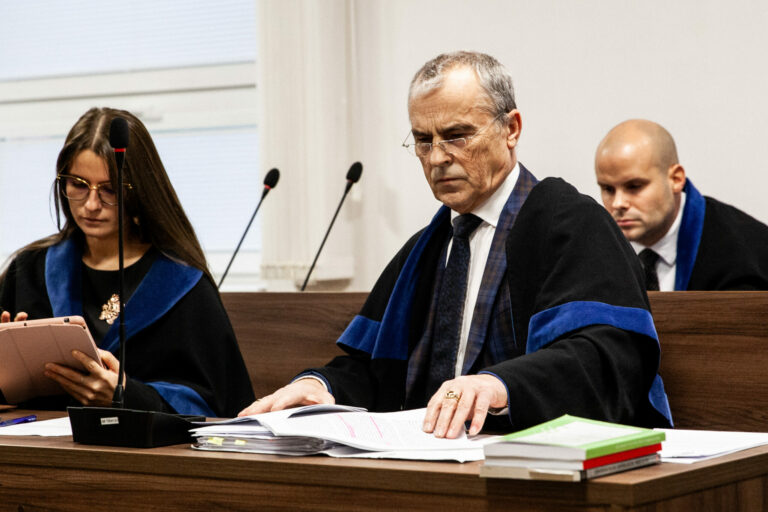 Obhájca Ondrej Mularčík (v popredí) počas hlavného pojednávania s guvernérom Národnej banky Slovenska Petrom Kažimírom počas jeho neprítomnosti v priestoroch Špecializovaného trestného súdu v Pezinku. Pezinok, 29. november 2024. Foto: SITA/Bokor Tomáš.