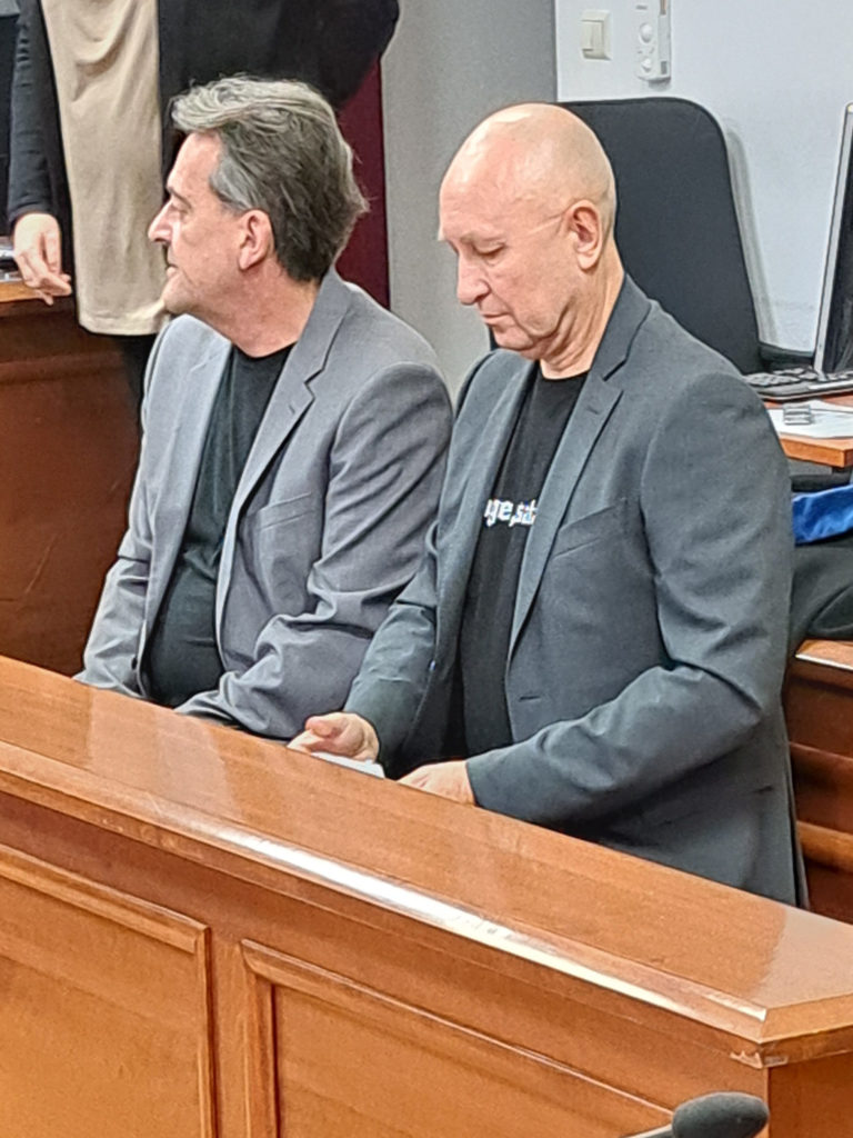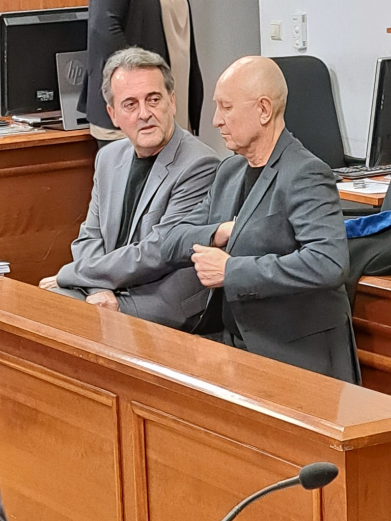 Zľava: Obžalovaní Richard M. a Zoroslav Kollár počas hlavného pojednávania so Zoroslavom Kollárom a spol. na Špecializovanom trestnom súde v Pezinku. Pezinok, 13. február 2024. Foto: SITA/Martin Šálek